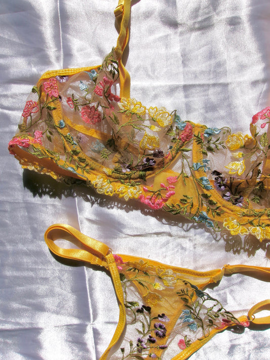Lingerie fleurie à dentelle 3 pièces - Jaune Florals